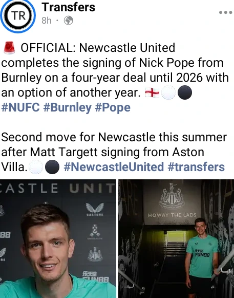 Stefan Ortega has a verbal agreement in place with Manchester City and waiting for greenlight from the club to complete the deal as they wanr to find a solution for Zack Steffen. Newcastle United have announced the signing of English Goalkeeper Nick Pope from Burnley at £10 Million on a 4 year contract until June 2026 with an option for another year. Kilmarnock have signed defender Lewis Mayo from Rangers on a season long loan deal. Olympiakos have announced the signing of right-back Gonzalo Pipa Avila from Huddersfield Town for an undisclosed fee on a three year contract after completing medical tests. Rotherham have announced the signing of wing-back Peter Kioso from Luton for undisclosed fee and on a three year deal.