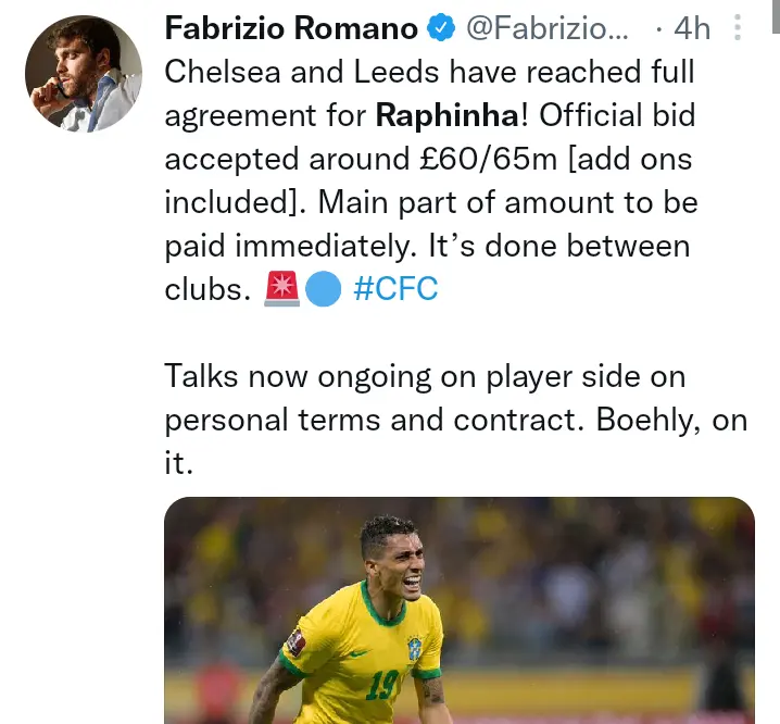 Chelsea have reached an agreement with Leeds United for the £60m transfer of winger Raphinha, with personal terms to be discussed next. (Fabrizio Romano)
