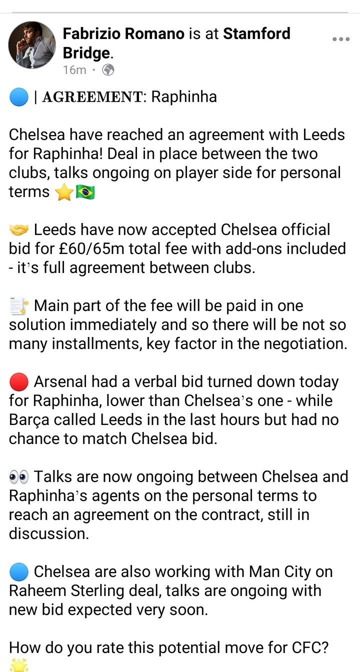 Leeds United have accepted Chelsea bid and noth teams have reached full agreement and only thing left is for Chelsea to agreed a deal with the player.
