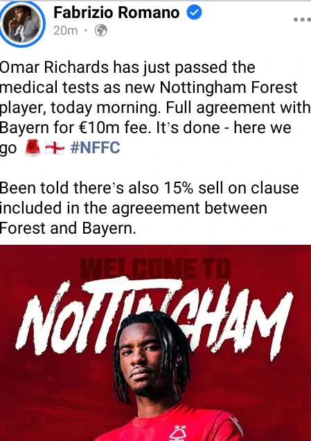 Nottingham Forest have signed Omar Richards from Bayern Munich for a €10 Million fee total package and joins on a four year contract. Omar Richards has passed his medical tests and his 4 year contract comprises of 15% sell-on clause at Nottingham Forest. Raheem Sterling will fly to London to undergo his medical tests at Cobham after Chelsea reached full agreement with Man City on £50 Million transfer fee for the English winger, who will sign a 5 year contract at Stamford Bridge until June 2027 with an option to extend for further year.