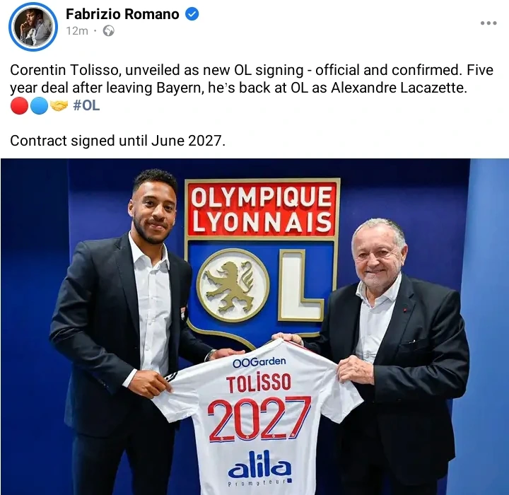 French Outfit, Lyon have completed the signing of free-agent midfielder Corentin Tolisso for a 2nd time on Friday morning as the France international returned to the Ligue 1 on a Bosman deal from German Champions, Bayern Munich after he left five years ago.