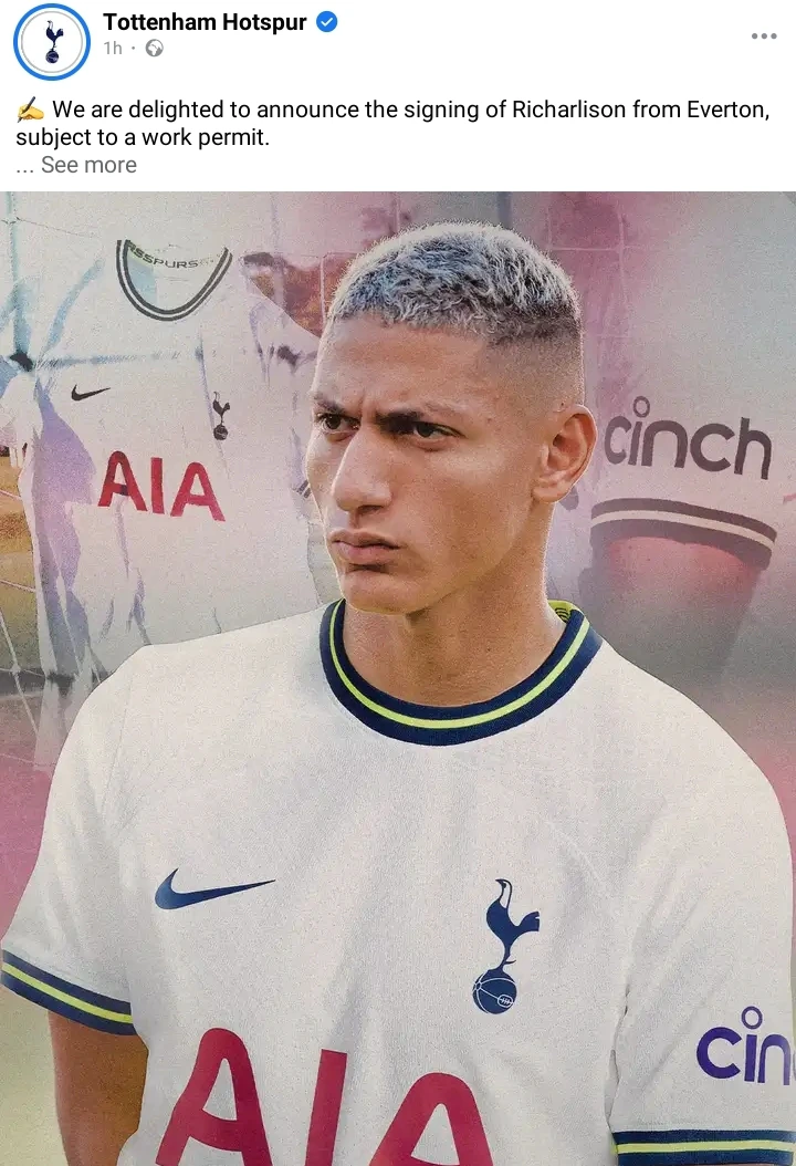 Antonio Conte's Spurs have announced the signing of Brazilan attacker, Richarlison from Frank Lampard's Toffees on a five-year deal that will keep him at the London based side until 2027.