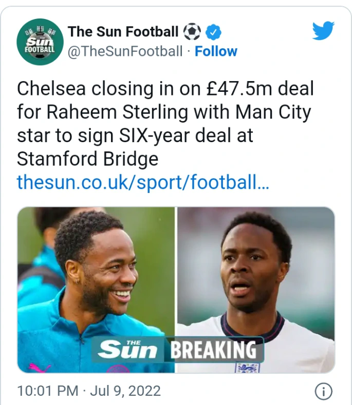 Chelsea have finally agreed a deal to sign England and Manchester city attacker Raheem Sterling on a six year deal in the summer transfer window, according to the Sun. However, the 27-year-old England international will join the Blues in a deal worth £47.5 million fee, with no further add-ons, the Athletic also understands.
