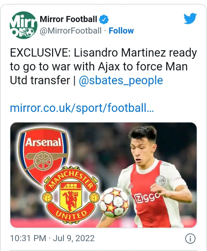 According to The Mirror, Argentina defender Lisandro Martinez could force his way out of Ajax in the summer transfer window. The 24-year-old Ajax defender is set to down tools as he awaits Manchester United to agree a deal with his current club.