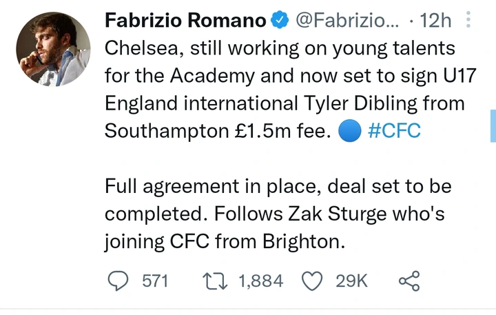 According to journalist Fabrizio Romano has confirmed Chelsea have a full agreement in place to sign Tyler Dibling from Southampton.