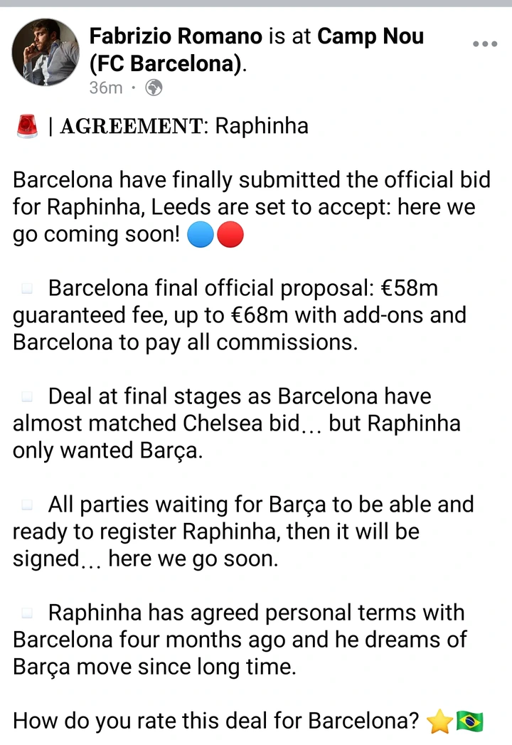Italian journalist Fabrizio Romano has reported that Barcelona has finally submitted an official bid for Leeds United for Raphinha. Barcelona have presented an official bid of €58m initial bid and €68m when ads-ons are included to Leeds United.