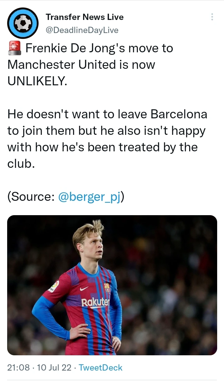 Frenkie De Jong's move to Manchester United is now unlikely according to reports.