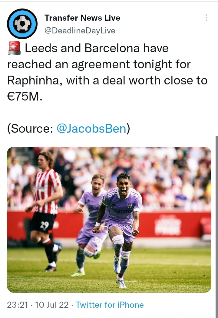 Spanish club, Barcelona, are set to sign Brazilian winger, Raphinha, after reaching agreement with Leeds United for the fee of the player.