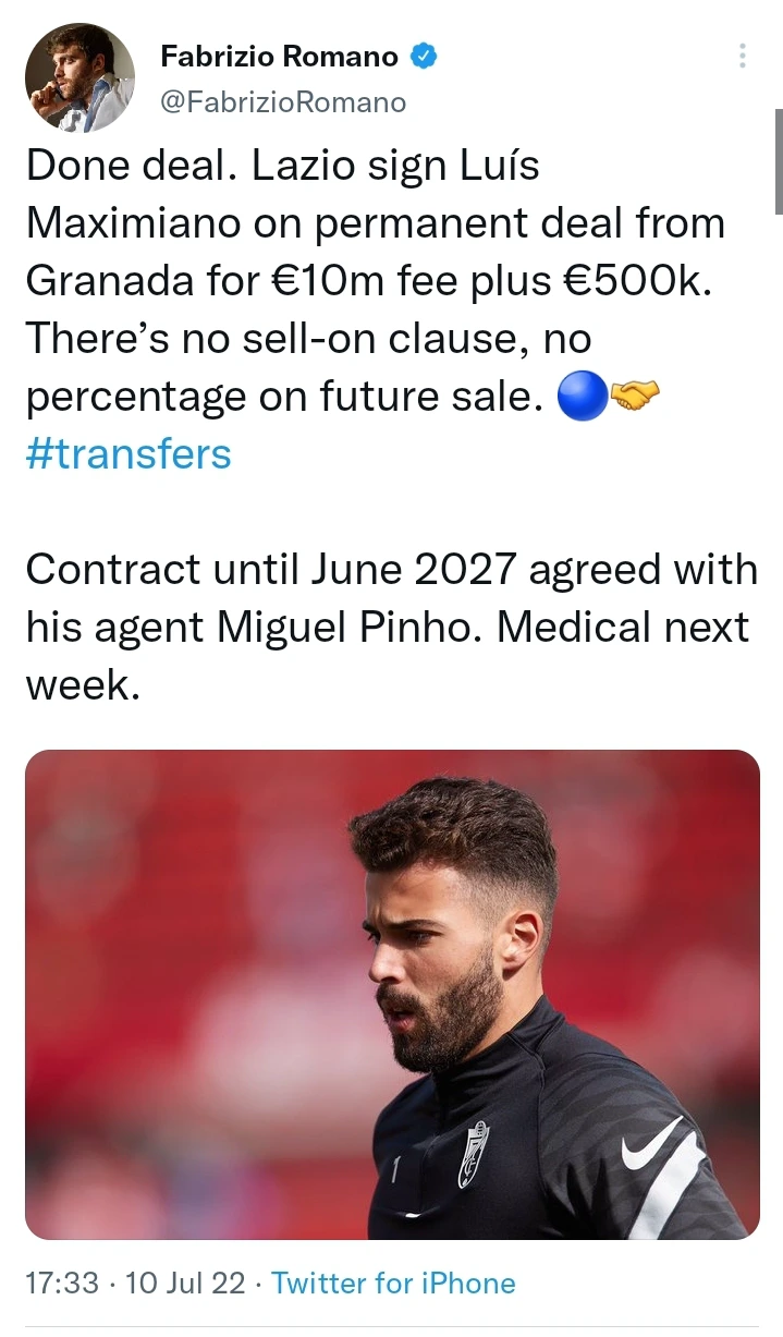 Italian club, Lazio has signed Luis Maximiano on permanent deal from Granada.