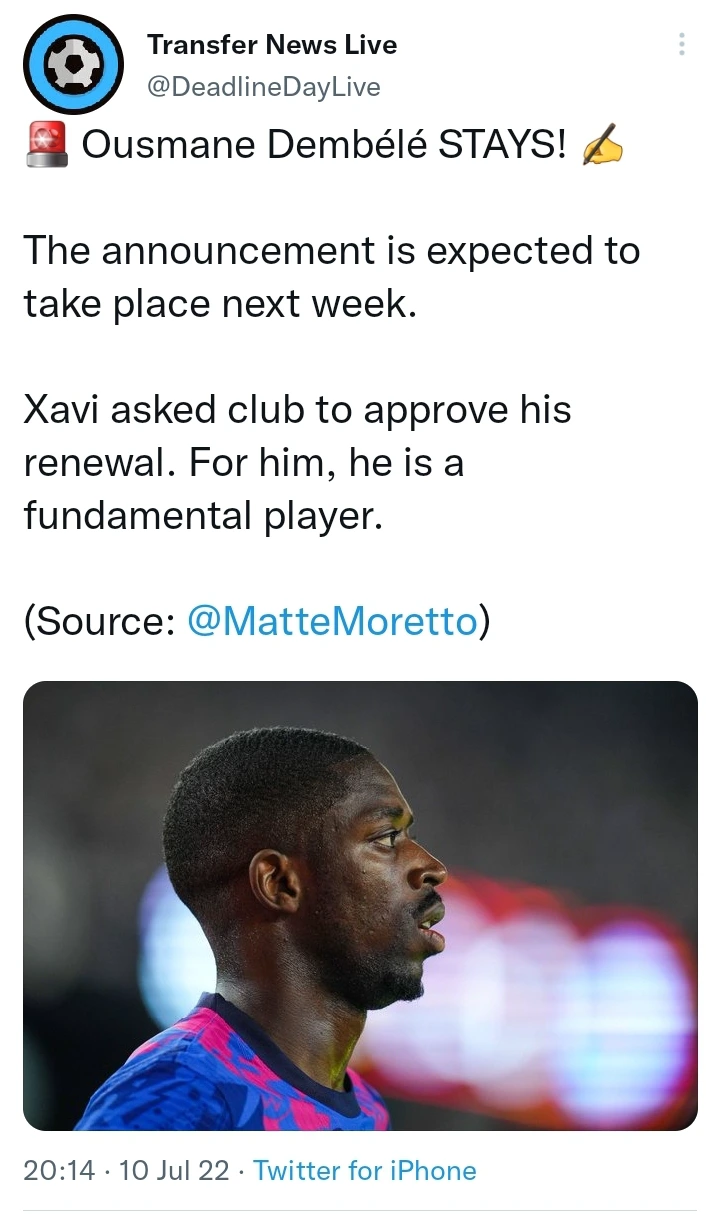 French winger, Ousmane Dembele is set to stay at Barcelona after agreeing to accept a contract offer which was 40% lower than the one he rejected last December from Barcelona.