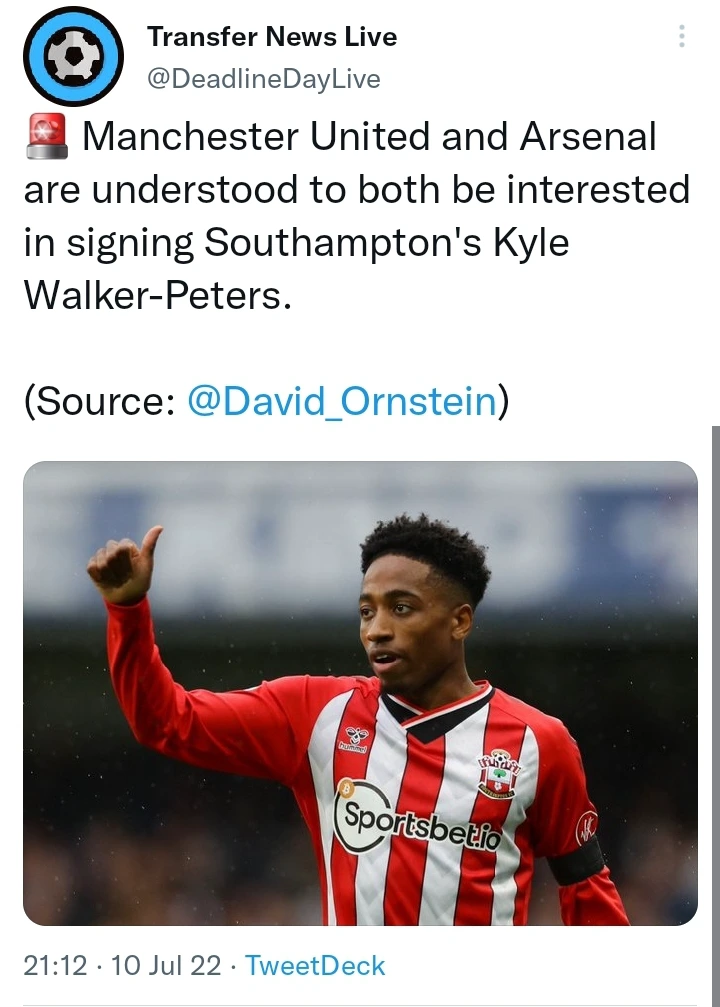 English club, Manchester United alongside their premier league rival, Arsenal are reported to be interested in Southampton right-back, Kyle Walker Peters.