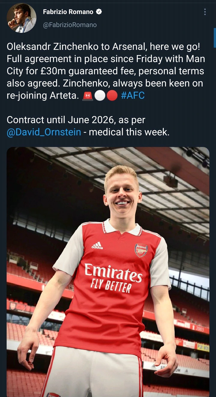 According to latest reports via Fabrizio Romano, Arsenal are planning for next steps to unveil Oleksandr Zinchenko as new signing. He could leave Manchester City camp later today, in order to join Arsenal and complete medical tests. Arsenal are already preparing official contracts and then schedule medical tests for Oleksandr Zinchenko. Deal in place for £30m fee with Man City - player accepted as he's happy to work again with Arteta.