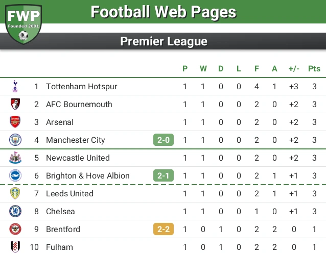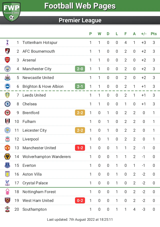 Starting off from the top 3 positions in the Premier League table, Tottenham occupy the top position after their 4-1 win, Bournemouth are close behind them in second after their win over Aston Villa. In 3rd spot is Arsenal who beat Crystal Palace 2-0 on Friday night. Going further in the table, Manchester City overtook Chelsea after their 2-0 win over West Ham this evening. They are in the 4th position and Newcastle, Brighton, Leeds and Chelsea all occupy the 5th, 6th, 7th and 8th spots.