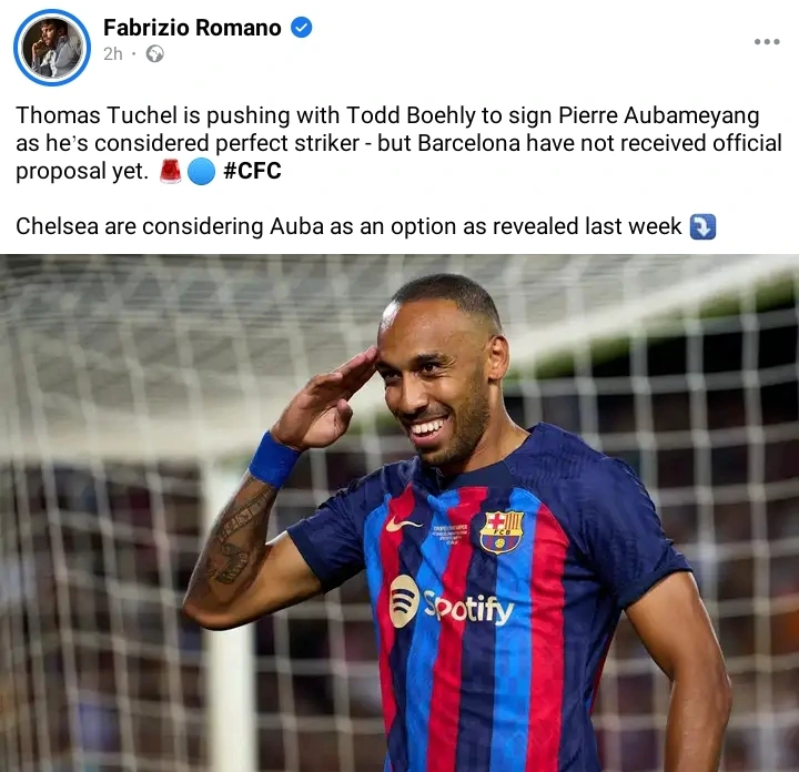 According to reports from reliable transfer expert, Fabrizio Romano, Chelsea Boss, Thomas Tuchel is pushing New Owner, Todd Boehly to sign the Gabon international, Pierre-Emerick Aubameyang from Spanish heavyweights, Barcelona.