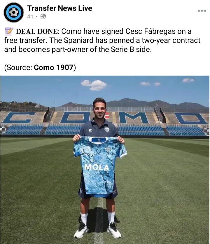 Former Arsenal and Chelsea midfielder Cesc Fabregas has joined Italian Serie B side Como on a free transfer