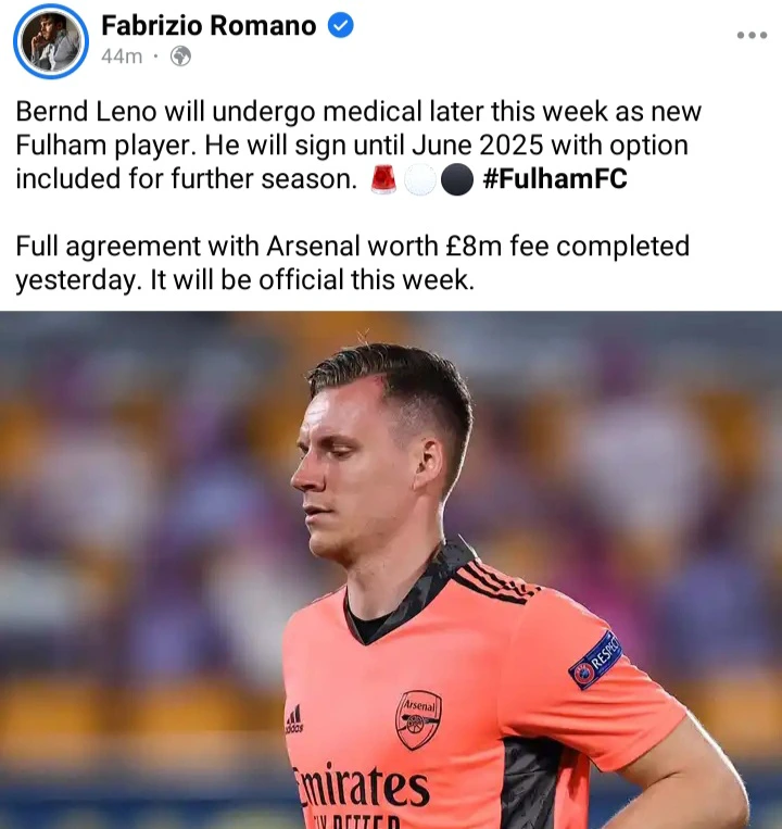 Arsenal goalkeeper Bernd Leno will undergo his medical test this week and will sign as a new Fulham player.