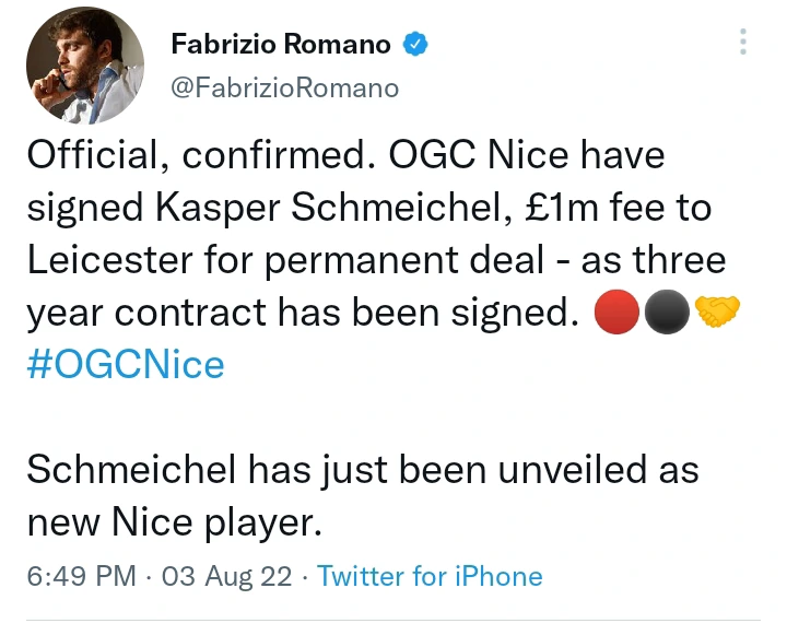 According to Fabrizio Romano, Leicester City star goalkeeper Schmeichel has completed a move to OGC Nice. The top goalkeeper joins the top club for a fee of £1m on a permanent deal.