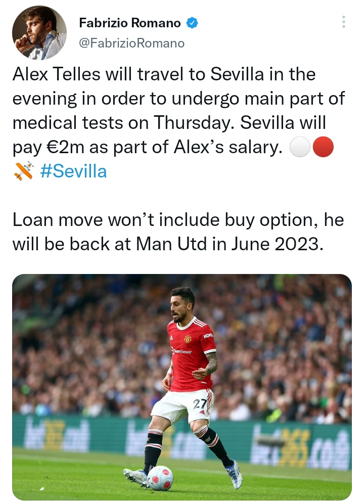 According to Fabrizio Romano, Man United player Alex Telles will undergo his medical tomorrow as he is close to joining Sevilla on a loan deal. Sevilla will pay €2m as part of Alex Telles's salary as the loan move won’t include a buy option.