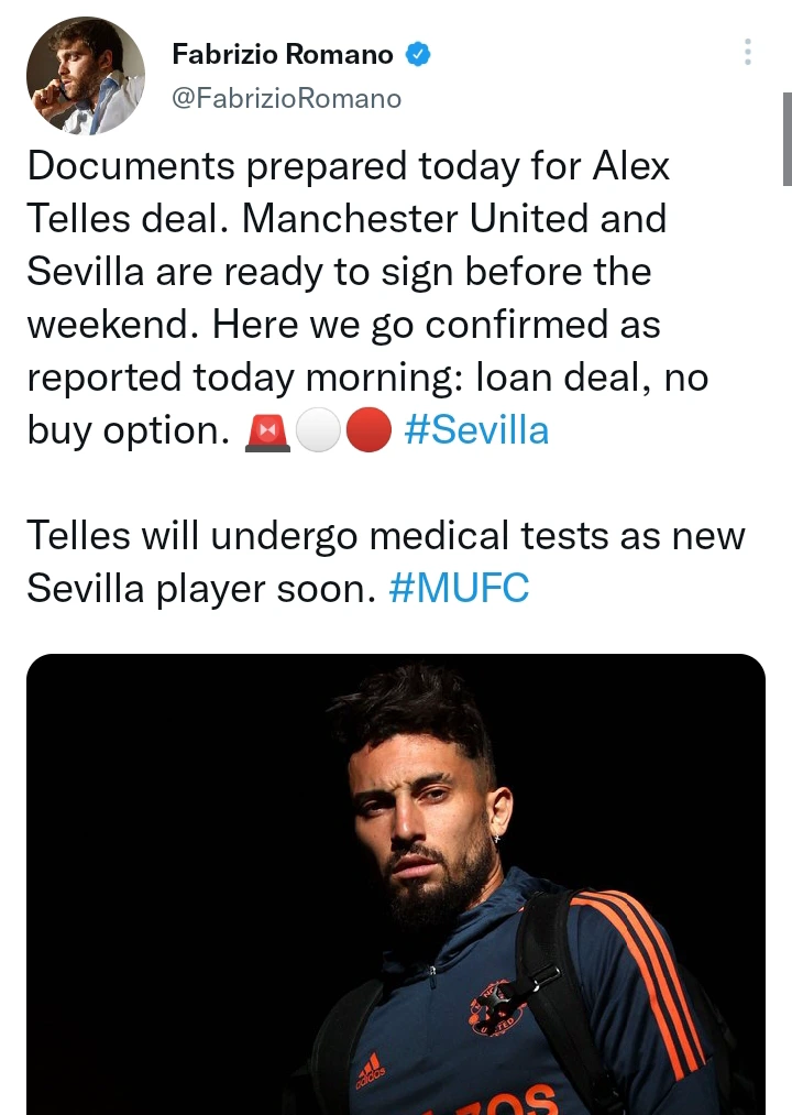 According to report, Manchester United star player Alex Telles is set to undergo his medical tests ahead of a move to Spanish side Sevilla. According to Fabrizio Romano, Documents have been prepared today for Alex Telles's deal as both Manchester United and Sevilla are ready to sign before the weekend.